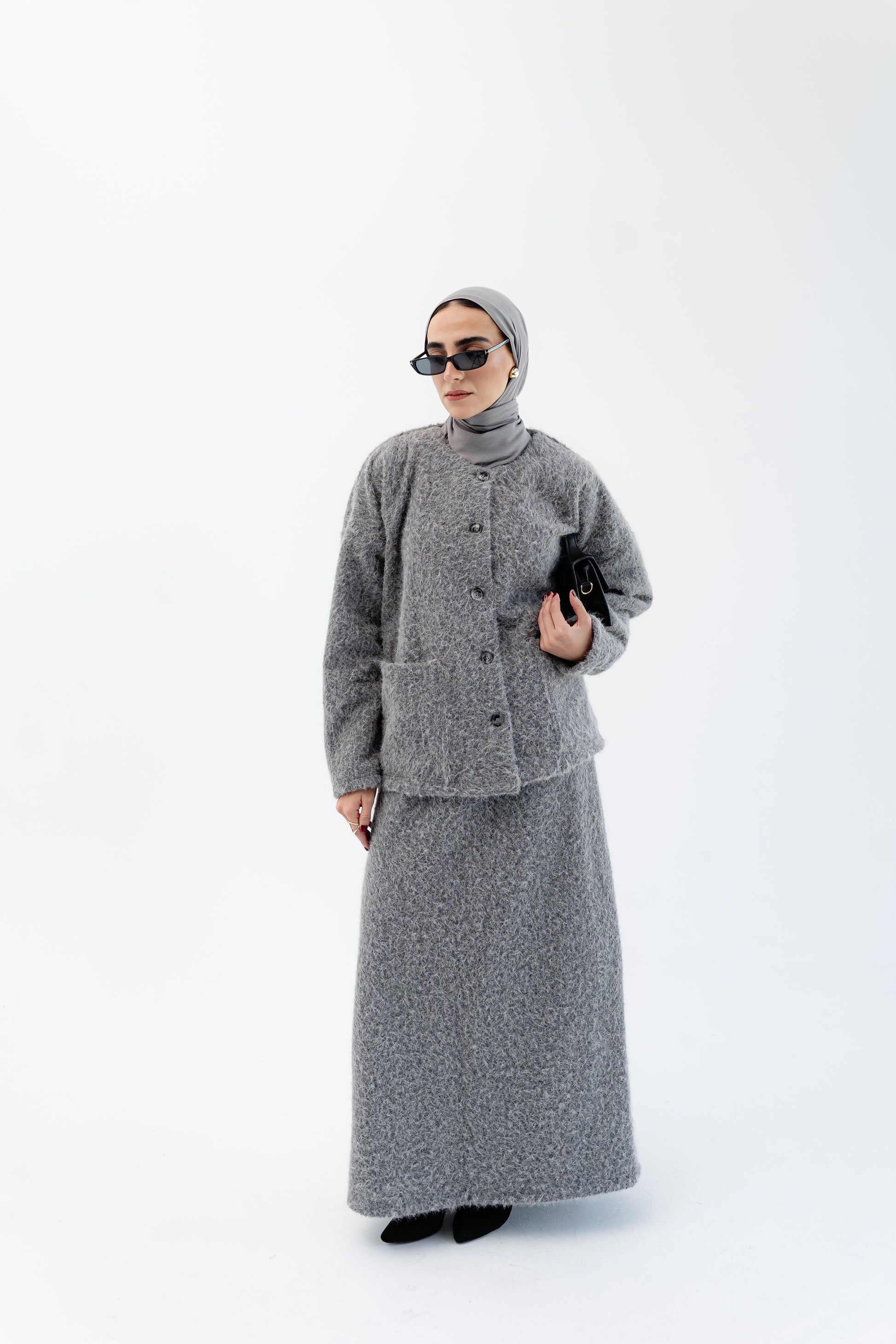 A refined two-piece set designed with a perfect balance of elegance and comfort. The jacket features a clean straight cut with front buttons and functional pockets, while the long skirt offers a graceful, flowing silhouette that enhances the overall look.
